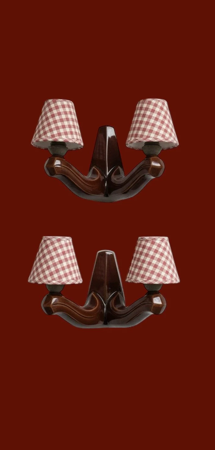 Pairing classic Art Deco lines with a touch of playful country charm, these brown ceramic wall lights bring warm character and soft, directional illumination to any room. Each sconce features a subtly sculpted ceramic backplate finished in a deep, matte brown glaze that highlights crisp geometric contours typical of the 1920s–1930s aesthetic. The fixtures are finished with vintage red gingham fabric shades—small, tapered drum shapes that diffuse light into a cozy, inviting glow.